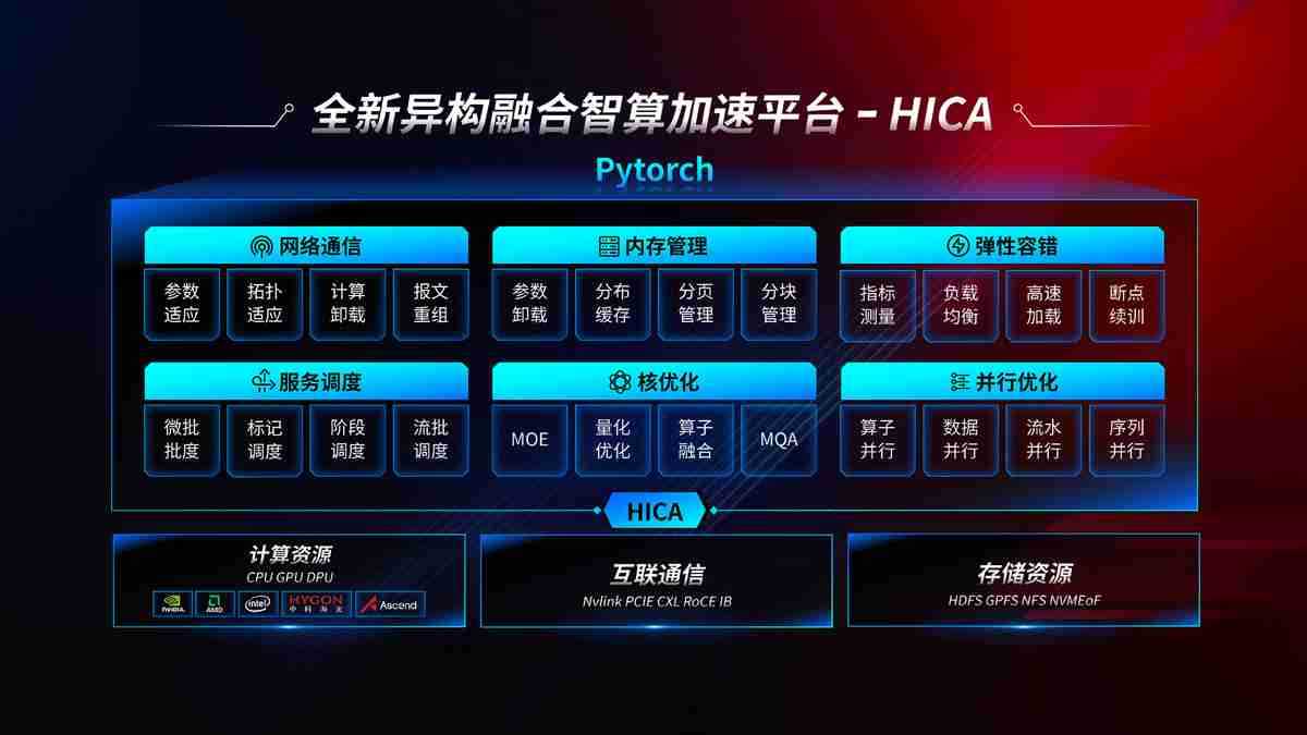 通过自研的服务层、、、中间适配层、、、、以及调度编排算法,,,,采用数据并行、、、模型并行等多种并行方式,,把并行计算任务进行有效的分解,,,使其分别由相应的软件栈和算力资源来承接。。。。当GPU资源变化,,,,HICA可以实时动态调度计算子任务并调整模型拓扑和架构,,,以充分聚合各种算力资源。。。