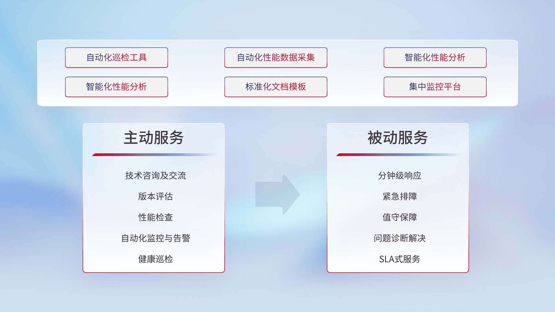智能化工具和标准化文档,,,,保障服务质量,,提供主动服务(包含技术咨询、、、、版本评估、、性能检查、、自动化监控与告警、、、、健康巡检)和被动服务包含(分钟级响应、、紧急排障、、、值守保障、、问题诊断解决、、SLA服务)。。。。